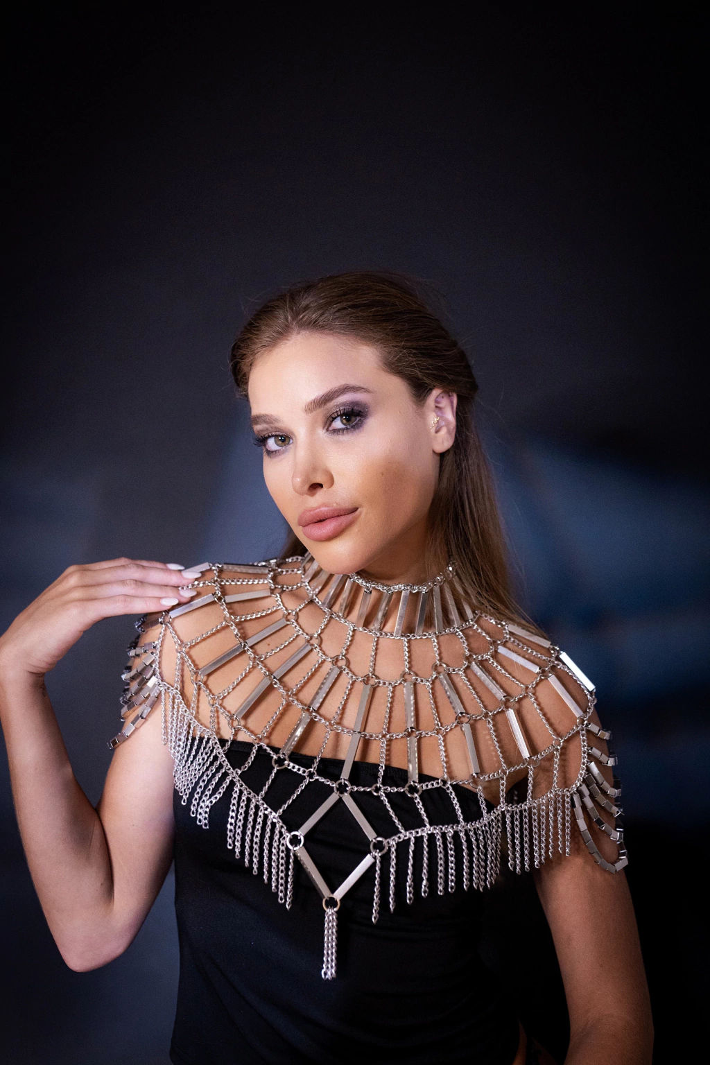 Esta ombreira é mais do que um acessório; ele cobre todo o busto e conta com correntes e tubos que trazem um toque de ousadia e elegância.