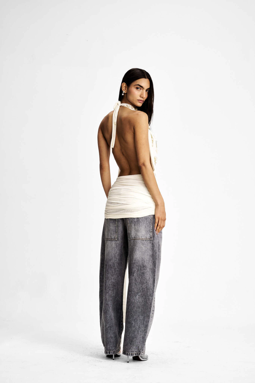 O decote profundo e a modelagem frente única valorizam a silhueta com fluidez, enquanto a amarração lateral da saia acrescenta movimento e charme à composição.